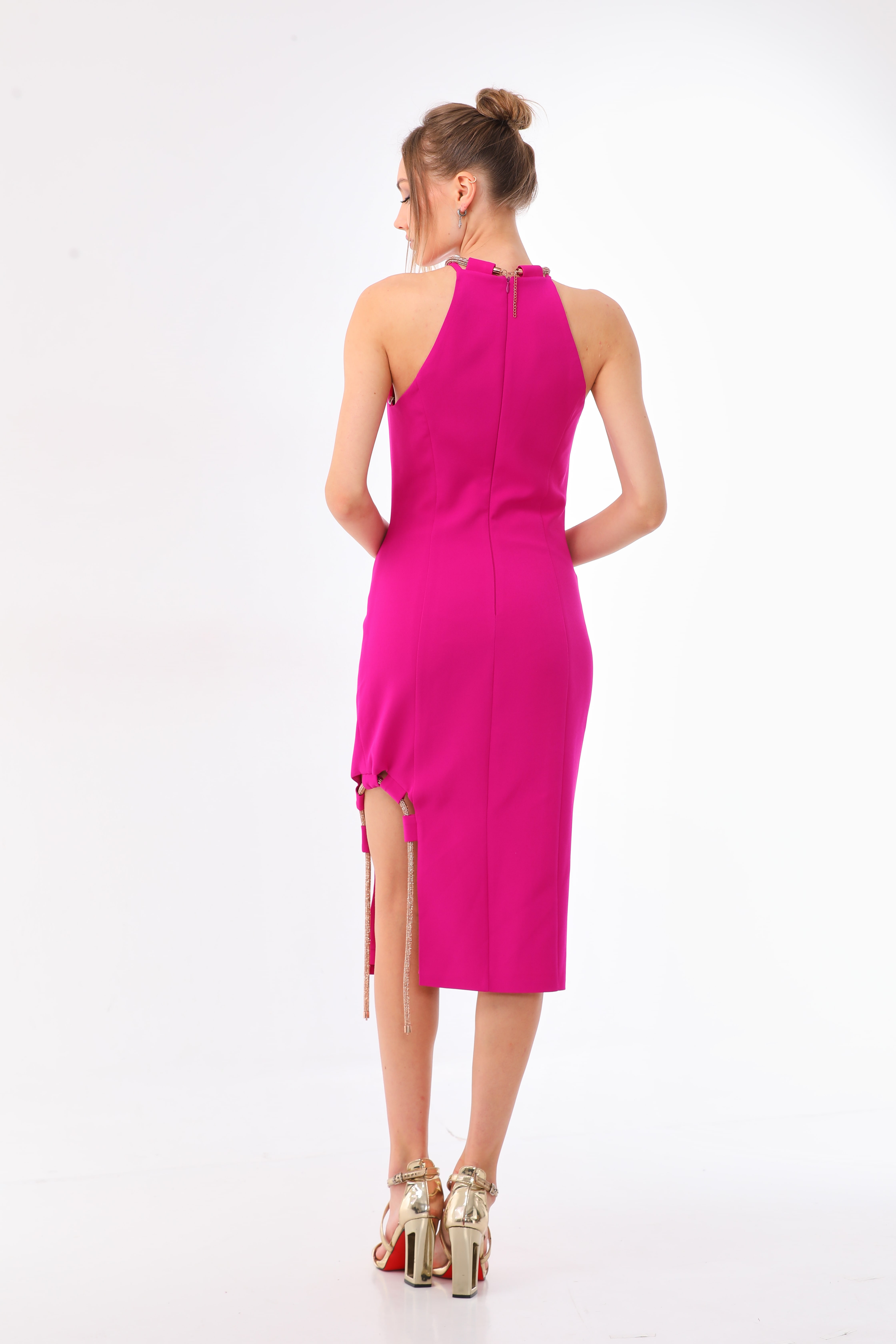 Make a statement in this shimmering Cocktail Dress with Golden Trim. The high neckline and cutout split are accentuated by a sparkling golden lining, while the sleeveless cut and bodycon silhouette create a sleek and elegant look that is sure to turn heads at any special occasion or night out.