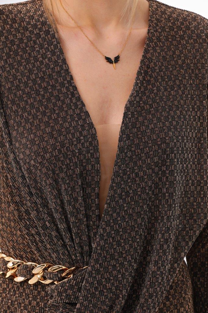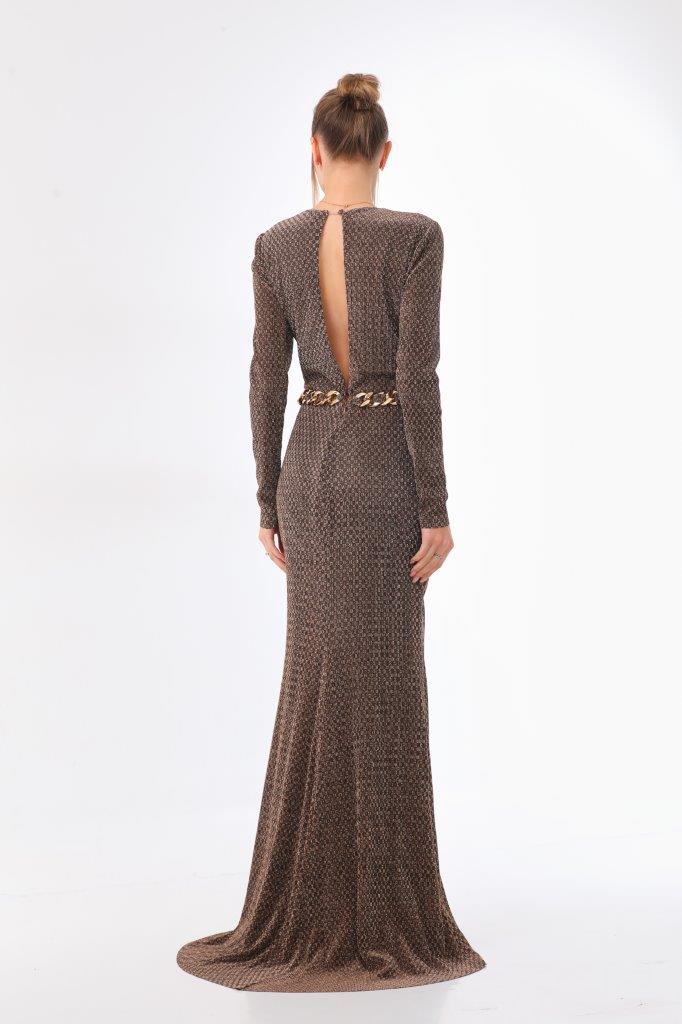Indulge in an exquisite attire that exudes an aura of refinement and femininity with its striking and elegant style. The luxurious dress showcases a captivating blend of gold metallic finish and houndstooth pattern that emanates a grandiose presence. The ruched bodice is accompanied by a front slit that accentuates your silhouette while the modern twist of a gold chain belt adds a touch of edginess to the ensemble. Immerse yourself in the opulence of this lavish dress and leave an unforgettable impression on any occasion.