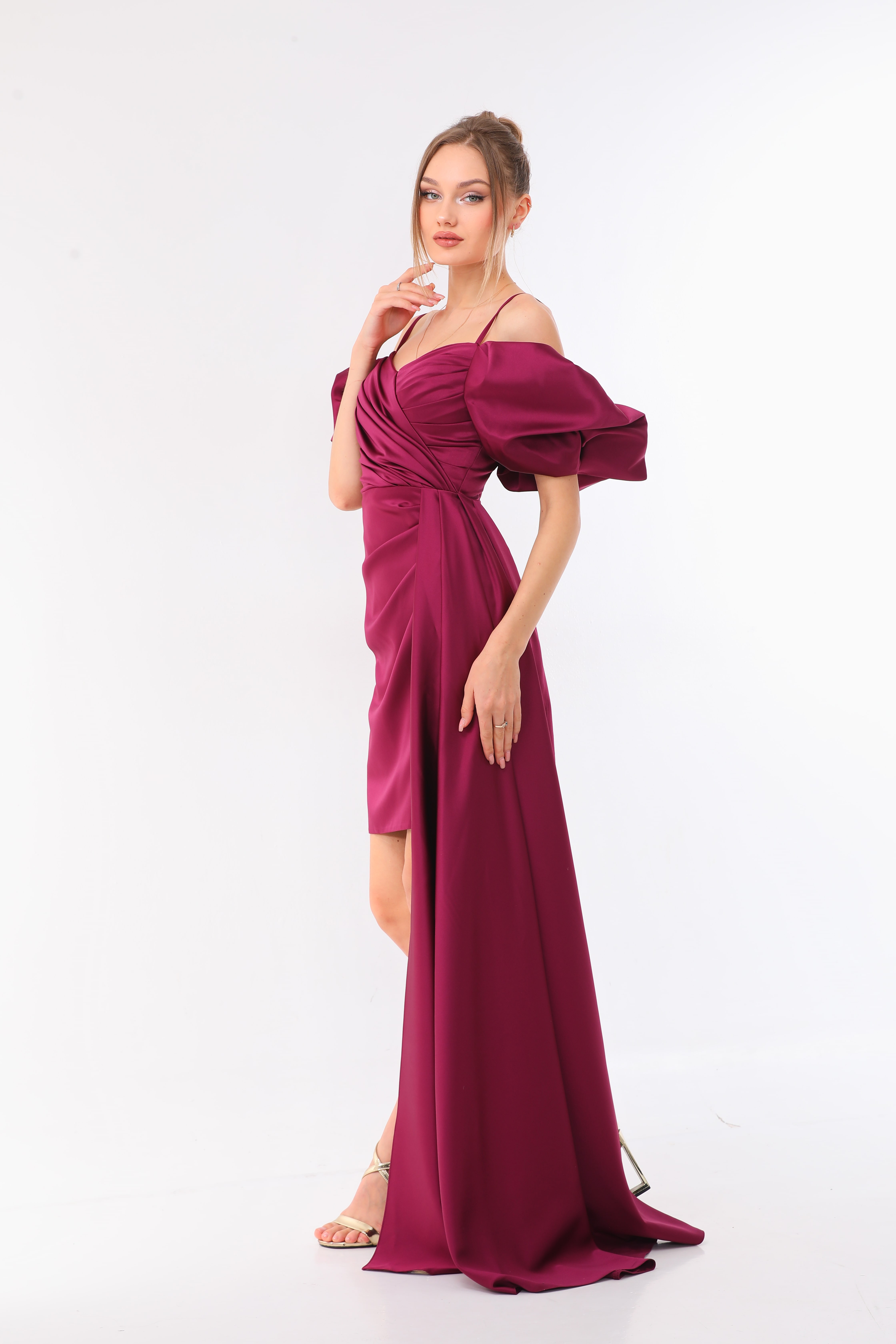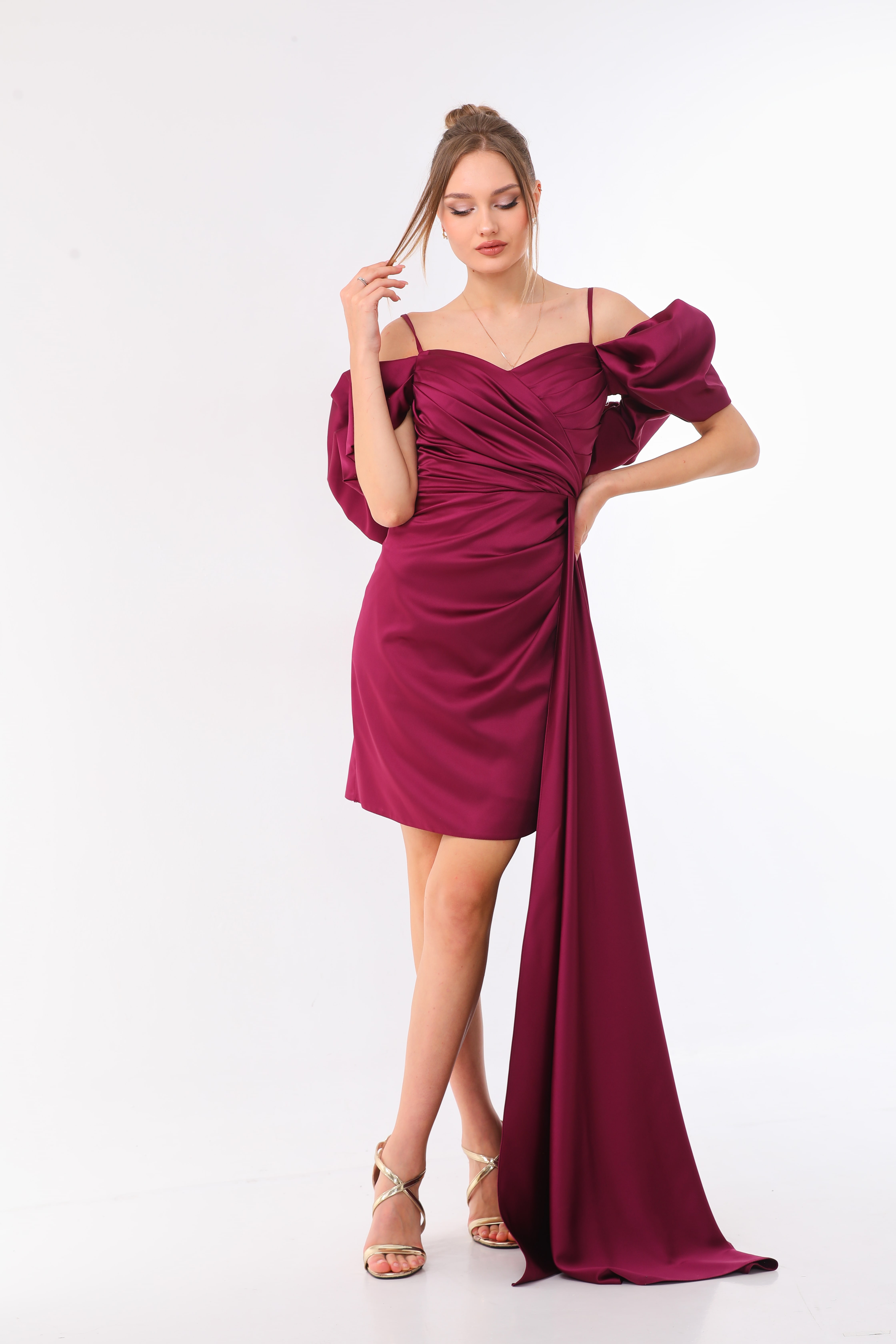 Looking for a dress that will make you feel like royalty? The Cold Shoulder Satin Mini Dress is just what you need! Its elegant design features a ruched bodice with a high-end satin fabric, puff sleeves, and a flattering sweetheart neckline.
